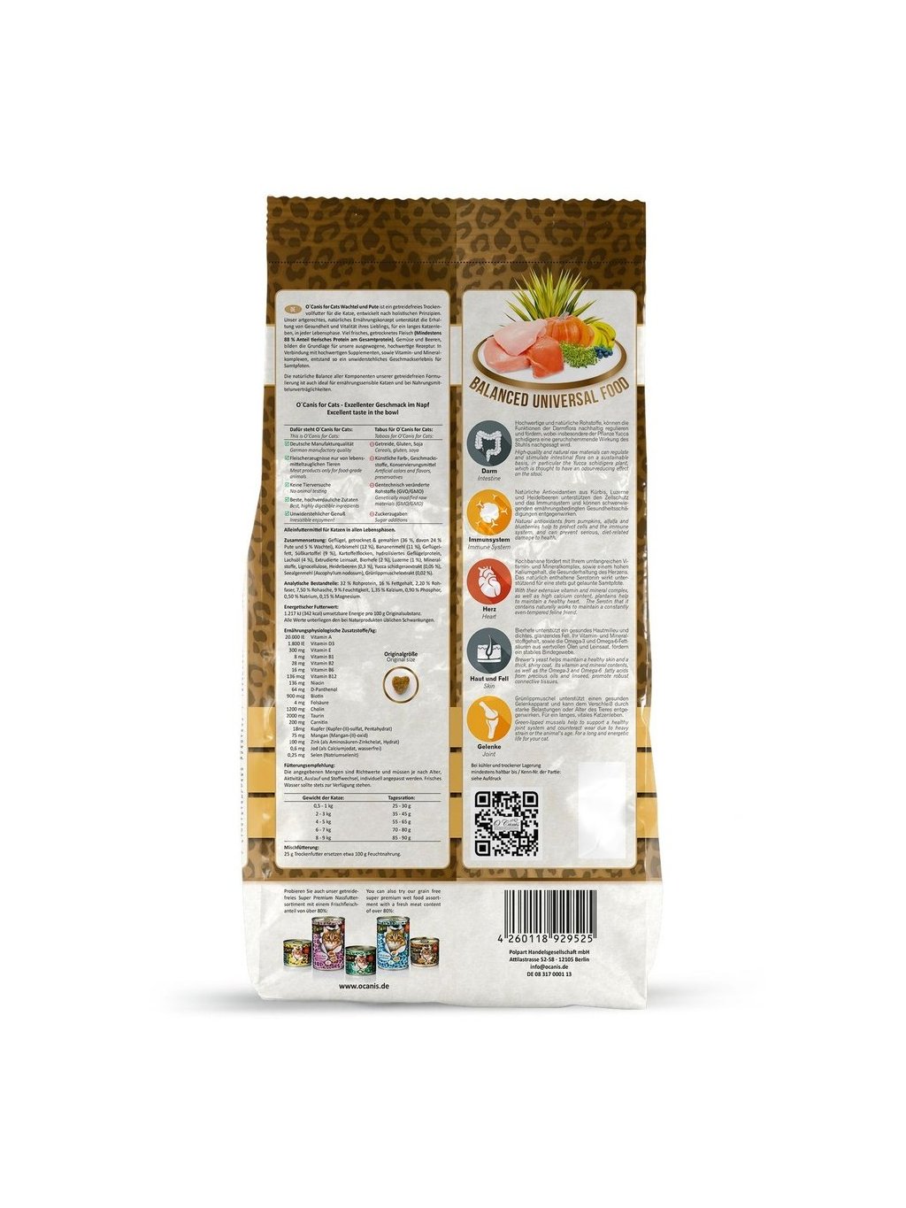 Receptura O'Canis pro kočky s křepelčím a krůtím masem jsou hypoalergenní granule zcela bez obilovin (Grain Free) vyvinuté podle holistických zásad.