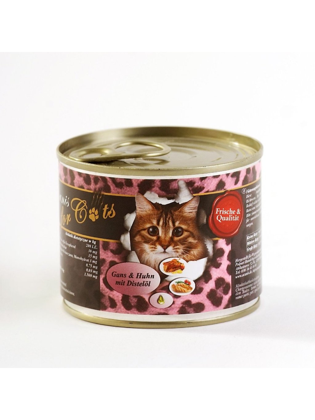 Masová konzerva O'Canis pro kočky husa a kuře se světlicovým olejem je doplňkové krmivo bez obilovin (Grain Free) pro kočky se spoustou čerstvého masa vhodné pro všechny plemena a věkové kategorie koček.