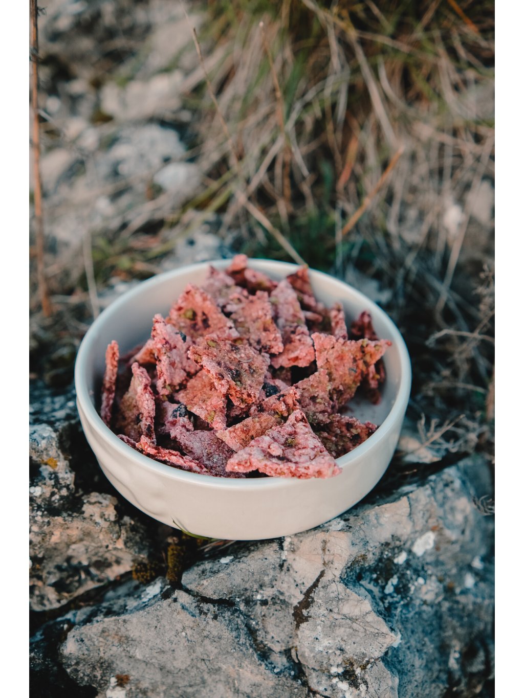 Krvavý nachos je křupavá, voňavá dobrota z hovězích drštěk, řepy a bezlepkové ovesné mouky, obohacená o naši vlastní bylinnou směs Energie, kterou dobře znáte z bylinkových směsí Ecopets.