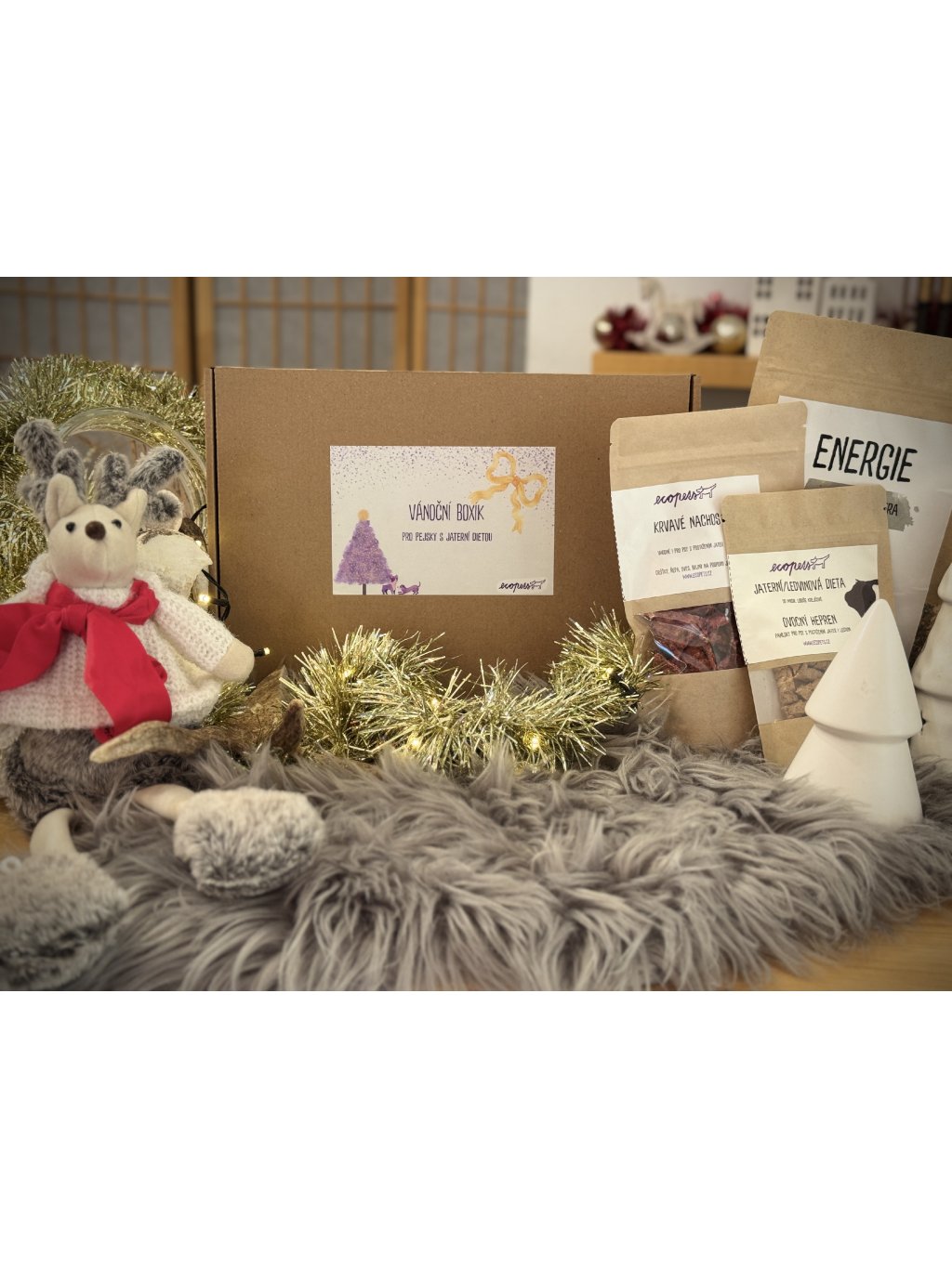 Všechny produkty v boxu se skvěle doplňují – najdete v něm bylinnou směs Energie, multivitamin pro posílení organismu a pamlsky vhodné i při jaterní dietě.