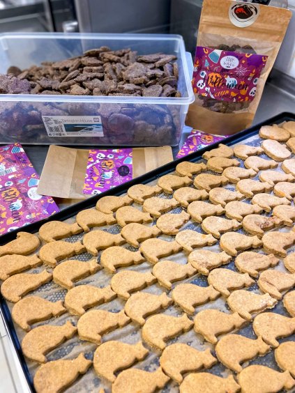 Chrumkavé domáce sušienky pre psov vo forme piškót s cviklou, mrkvou a špenátom.